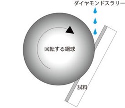 簡易膜厚では回転する鋼球で試料を研磨し、その研磨痕を光学顕微鏡などにより測長することで膜厚を測定します。ダイヤモンドスラリーを塗布したボールを用いた球面研磨法によるユニークな膜厚測定機です。試料の埋め込みや研磨といった煩わしい作業なしで迅速で簡便ながら精度よく薄膜や表面改質層の厚さを測定できます。