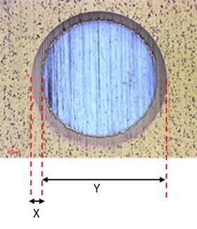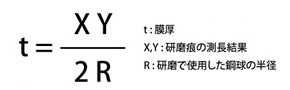 光学顕微鏡等で研磨痕で測長し、ISO26423 Determination of coating thickness by crater grinding method に記載された下記計算方法を用いて膜厚を算出致します。 |